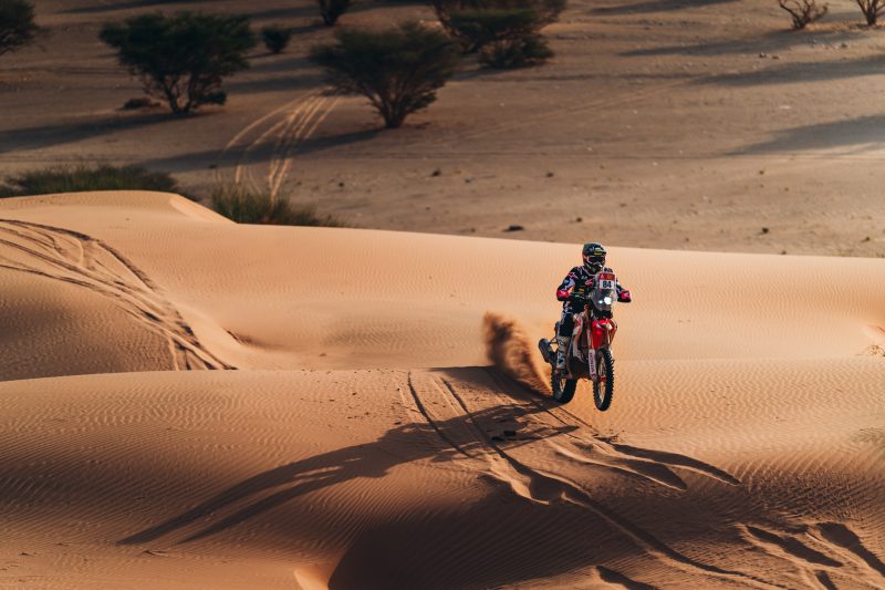 After losing his overall lead, Preston Campbell took a reflective approach yesterday, fully aware of the challenge ahead. On the 331 km special stage from Al Henakiyah to Yanbu today, he rode his Honda CRF450RX RALLY with confidence, powering through rocky sections before tackling the dunes. Another podium finish saw him in third place, five and a half minutes behind stage winner Michael Docherty. However, his main rival, Toni Mulec, finished nearly four minutes ahead, stretching the overall gap to 6’12”.